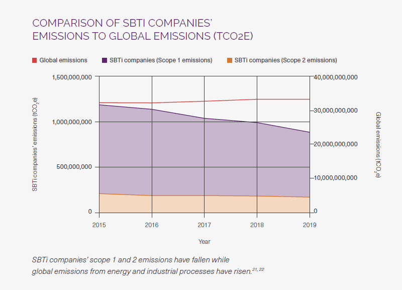 [3] 338 companies out of 478 total SBTi companies with targets (SMEs using the streamlined route were excluded) are included in this analysis. Companies that were missing any emissions data between 2015-2019 were excluded. Emissions data was derived from public and private disclosures through CDP, as well as public sources such as sustainability reports. In all cases, emissions data was reported by companies. The reported emissions reductions may be due to any number of factors including concerted emissions reduction efforts, changes in activity levels or types, and changes in business structure.