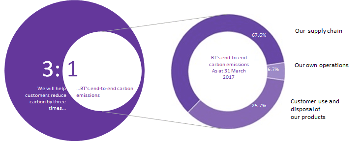 Caption: BT’s goal is to help its customers reduce carbon emissions by three times its own end-to-end carbon impact. The diagram shows the breakdown of BT’s direct and indirect emissions.