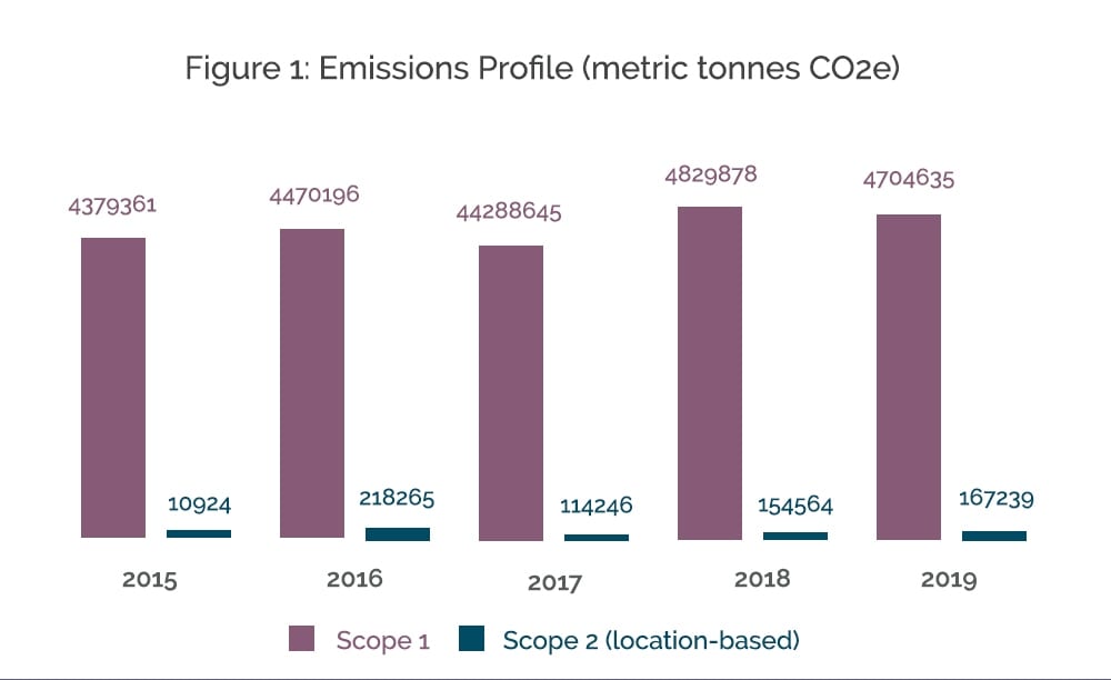 Meeting science-based targets in the context of a growing business can be difficult. Responding to this challenge, HZL has implemented a range of measures to reduce its Scope 1 and 2 emissions. Shifting from open cast mining to underground mining led to a significant saving in the consumption of high speed diesel, which resulted in emissions reductions of more than 68 thousand tonnes of CO2 equivalent in 2018. HZL has also: changed the brush seals of turbines and developed transformer taps to improve energy efficiency and reduce power consumption at all its thermal power plants; optimised the pressure settings of cement bulker-unloading compressors; and established more efficient cooling methods. The company has also advanced low-carbon energy by replacing compressors, switching from liquefied petroleum gas burners to electric heaters, installing LED lights, and modifying discharge lines. Due to an increase in production, overall Scope 1 and Scope 2 emissions increased from 2017 to 2018, however HZL’s emissions reduction measures have helped to reduce total Scope 1 and Scope 2 emissions by 2% between 2018 to 2019 (Figure 1).