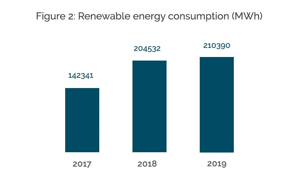 To further address indirect emissions, HZL increased its renewable energy portfolio. The company has recently commissioned a solar power plant with a 12 MW capacity at one of its zinc smelters, which is reducing HZL’s carbon footprint by approximately 14,000 MT a year. Similar renewable plants have increased the company’s clean energy capacity by 22 MW at its Rampura Agucha site and 4 MW at its Dariba site. Between 2017 and 2019, HZL increased its total renewable energy consumption by 48% (Figure 2) and currently consumes 100% of its self-generated renewable energy. HZL’s shift towards green power generation has reduced its carbon footprint by more than 66,000 MT of CO2 equivalent a year.