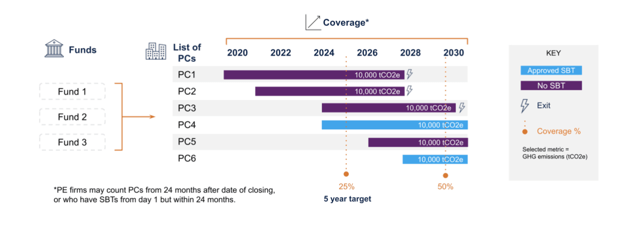 The Portfolio Coverage method is an engagement-based approach that can be best described as a ‘target of targets’. Under this method, a PE firm is required to set a target of up to five years, using a selected metric (GHG emissions preferably, or financial), to have a portion of its portfolio companies set their own science-based targets. The target must, at a minimum, be on a linear path to 100% of portfolio companies having validated science-based targets by 2040. For purposes of target setting, tracking, and reporting, the PE firm may choose to exclude portfolio companies acquired 24 months or less and without validated science-based targets, though it is recommended that this period does not exceed 12 months.
