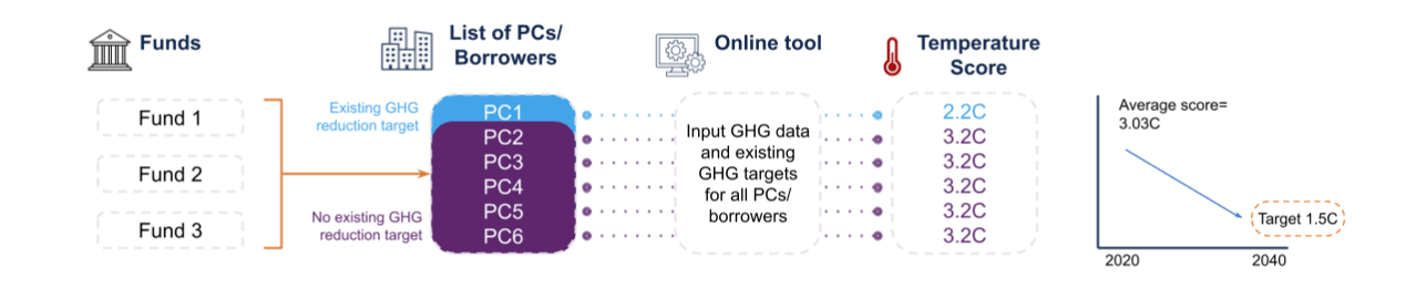 The Temperature Rating method is an extension of the Portfolio Coverage approach that enables PE firms to assess their portfolio temperature rating based on public GHG emissions reduction targets of their portfolio companies. GHG emissions data is required from each portfolio company and where this is not available, proxy data can be procured from a third party such as CDP. In the absence of an existing valid GHG emissions reduction target, a portfolio company is given a default score of 3.2°C, which represents an expected business as usual trajectory for the company, rather than being excluded from the analysis. PE firms must then set a target of up to five years to reduce their portfolio temperature scores (aggregated from their portfolio companies’ scores). The target must, at a minimum, be on a linear path to aligning: