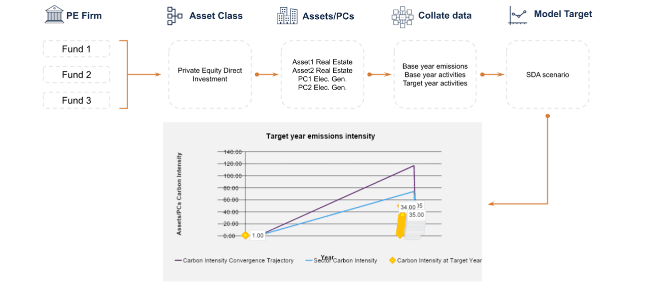 The Sectoral Decarbonization Approach (SDA) is a method for setting physical intensity targets, which is defined by a reduction in emissions relative to a specific business metric (e.g. metric tonne CO2e per tonne of product). PE firms will need to set SDA targets to converge the physical emissions intensity of their direct investments in electricity generation and real estate to a global sectoral level by 2050 in line with a 1.5°C pathway. For additional information on the SDA method, please see section 6.2 of the PE Guidance.