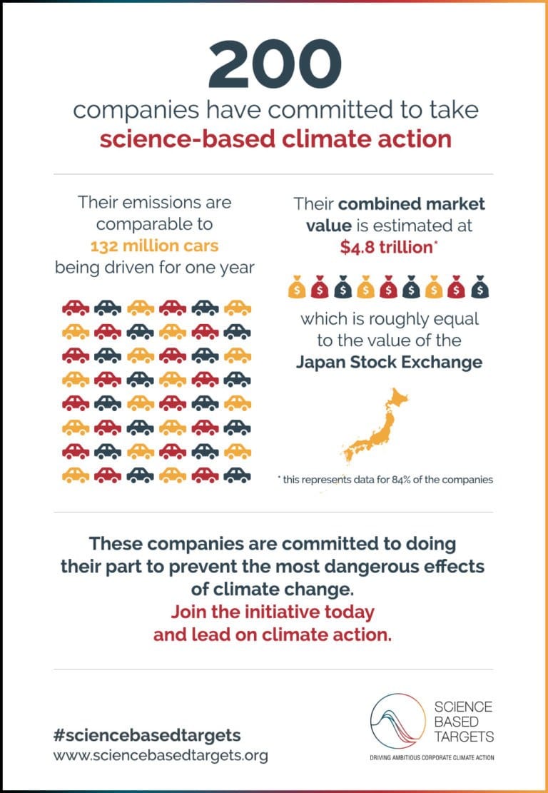 The 200 companies who have joined the Science Based Targets initiative to date have an estimated combined market value of USD $4.8 trillion, comparable to the total estimated value of the Japanese stock exchange group, and are collectively responsible for 627 million metric tonnes of direct CO2e emissions. They represent businesses across 33 countries and from many sectors including retail, food & beverage, electric utilities and automotives.